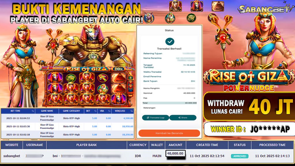 BUKTI KEMENANGAN 11 OKTOBER 2025 DI GAME RISE OF GIZA POWERNUDGE WD 40 JUTA