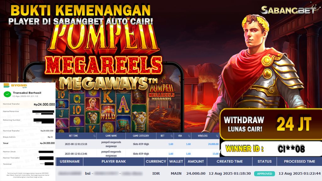 BUKTI KEMENANGAN 12 AGUSTUS 2025 DI GAME pompeii megareels megaways WD 24 JUTA