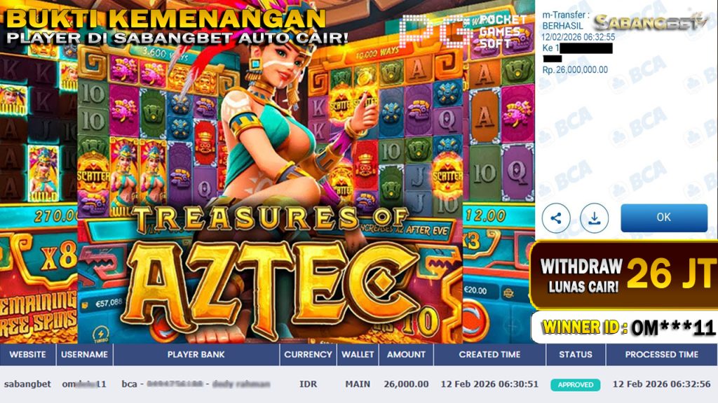 BUKTI KEMENANGAN 12 FEBRUARI 2026 DI GAME TREASURES OF AZTEC WD 26 JUTA