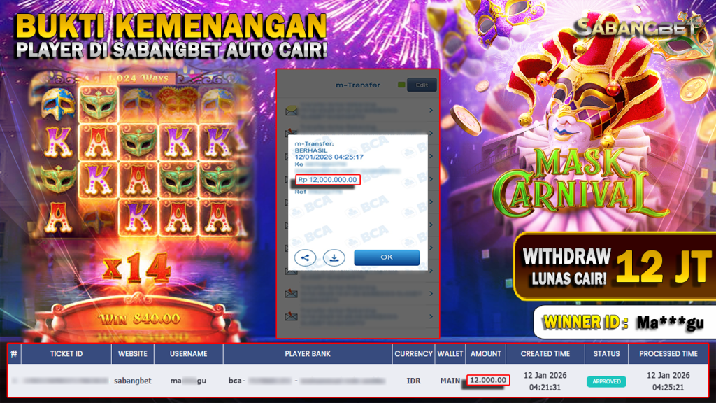 BUKTI KEMENANGAN 12 JANUARI 2026 DI GAME Mask Carnival WD 12 JUTA