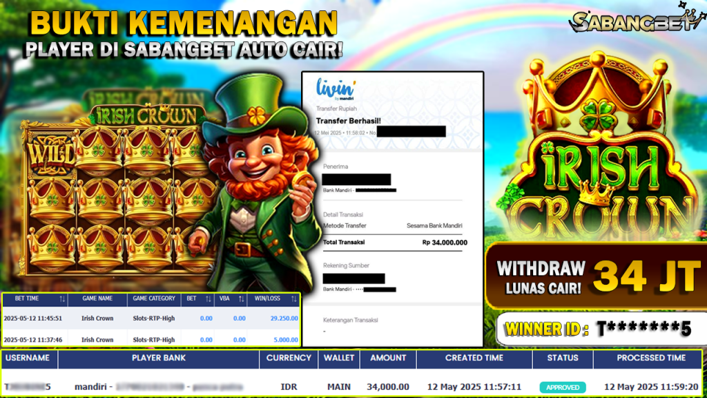 BUKTI KEMENANGAN 12 MEI 2025 DI GAME IRISH CROWN WD 34 JUTA