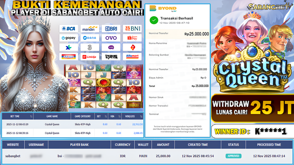BUKTI KEMENANGAN 12 NOVEMBER 2025 DI GAME CRYSTAL QUEEN WD 25 JUTA