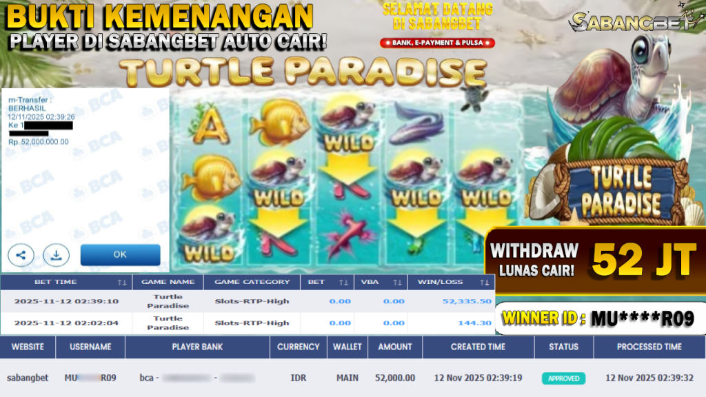 BUKTI KEMENANGAN 12 NOVEMBER 2025 DI GAME TURTLE PARADISE WD 52 JUTA