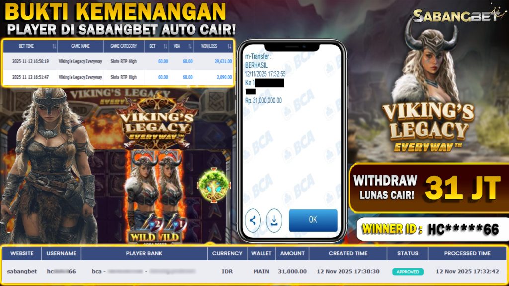 BUKTI KEMENANGAN 12 NOVEMBER 2025 DI GAME VIKING’S LEGACY EVERYWAY WD 31 JUTA