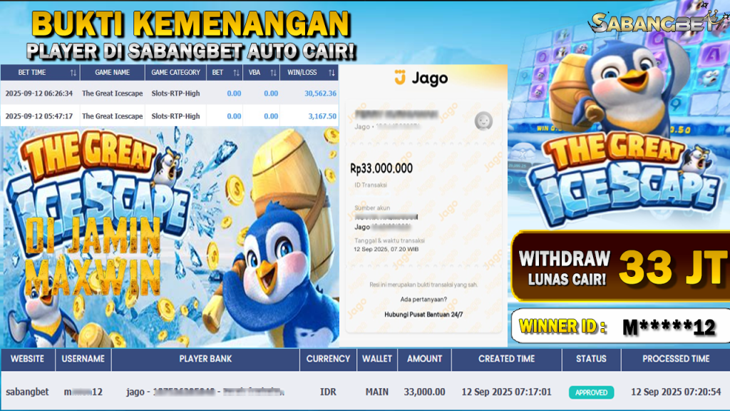 BUKTI KEMENANGAN 12 SEPTEMBER 2025 DI GAME THE GREAT ICESCAPE WD 33 JUTA