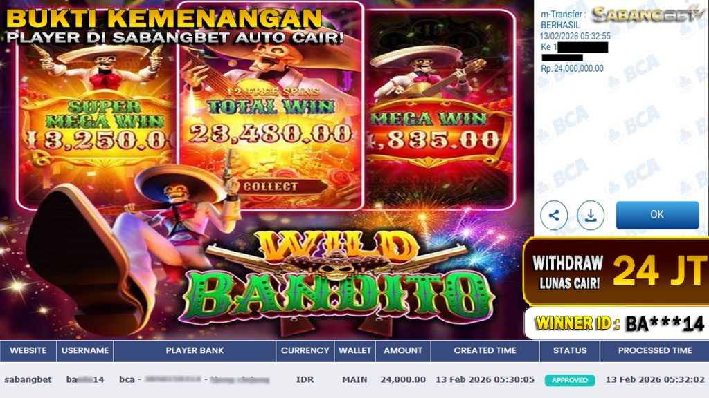 BUKTI KEMENANGAN 13 FEBRUARI 2026 DI GAME WILD BANDITO WD 24 JUTA