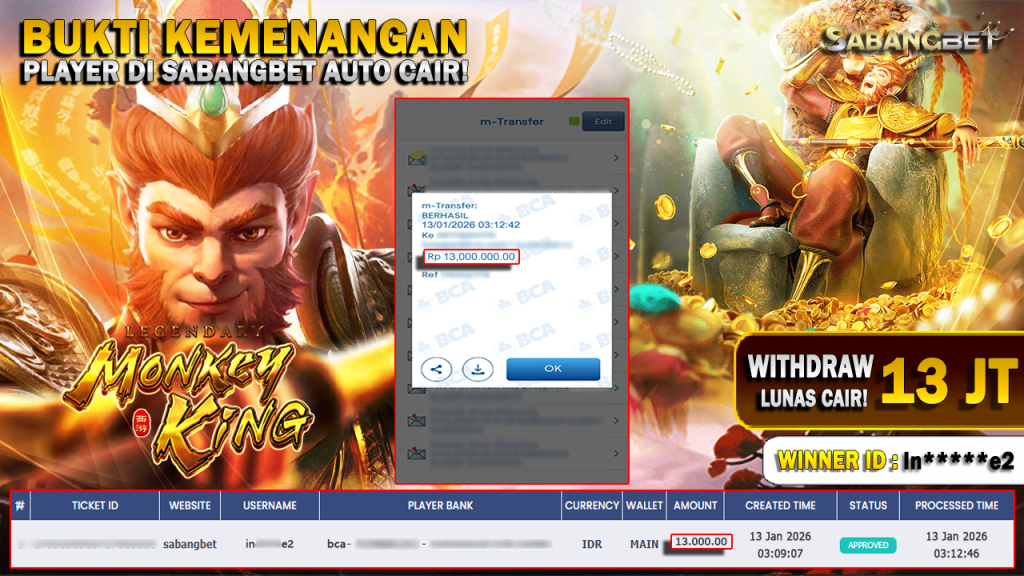 BUKTI KEMENANGAN 13 JANUARI 2026 DI GAME Legendary Monkey King WD 13 JUTA