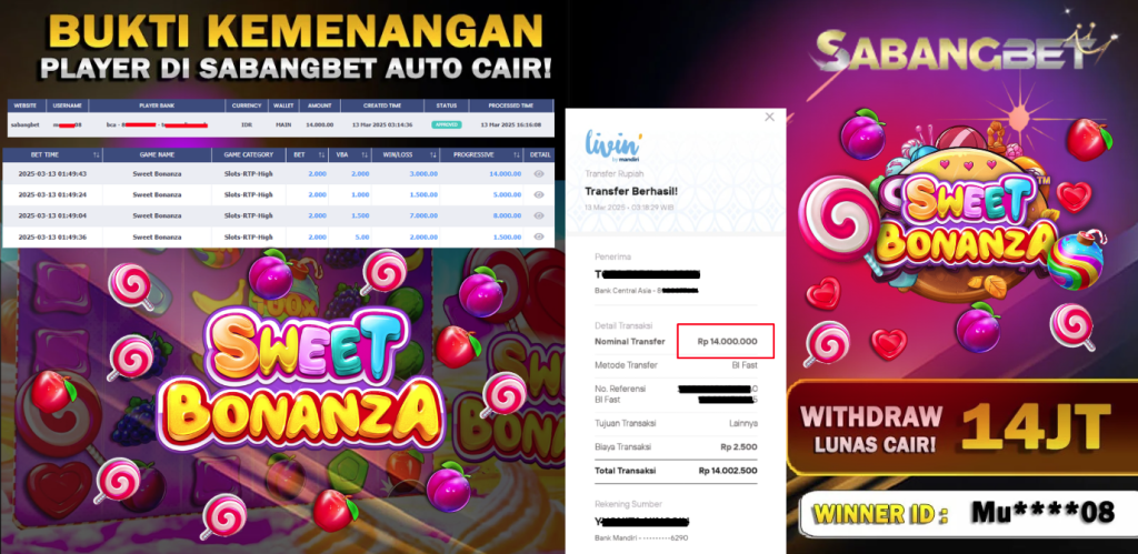BUKTI KEMENANGAN 13 MARET 2025 DI GAME SWEET BONANZA WD 14 JUTA