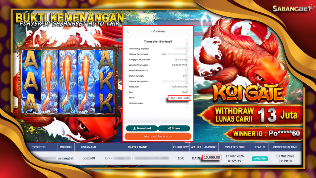 BUKTI KEMENANGAN 13 MARET 2026 DI GAME Koi Gate WD 13 JUTA