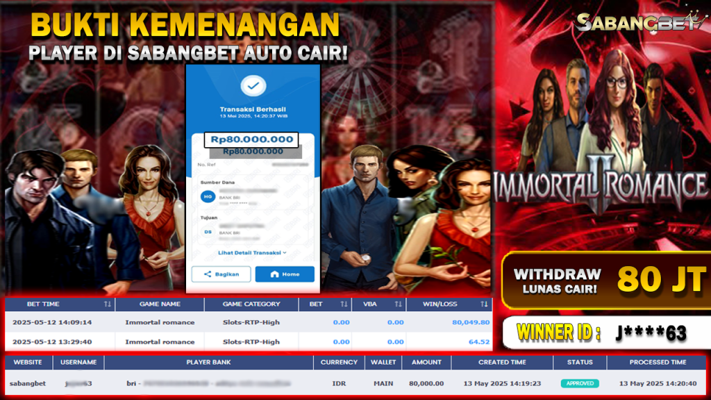 BUKTI KEMENANGAN 13 MEI 2025 DI GAME IMMORTAL ROMANCE WD 80 JT