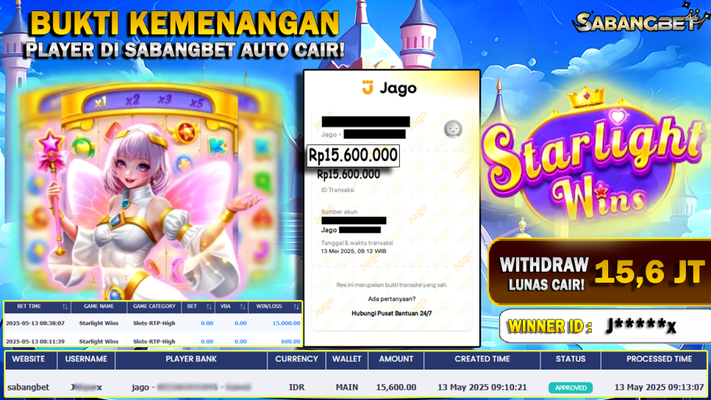 BUKTI KEMENANGAN 13 MEI 2025 DI GAME STARLIGHT WINS WD 15,6 JUTA
