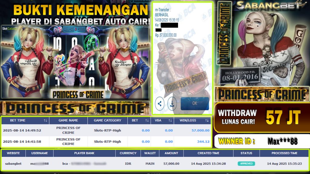 BUKTI KEMENANGAN 14 AGUSTUS 2025 DI GAME PRINCESS OF CRIME WD 57 JUTA