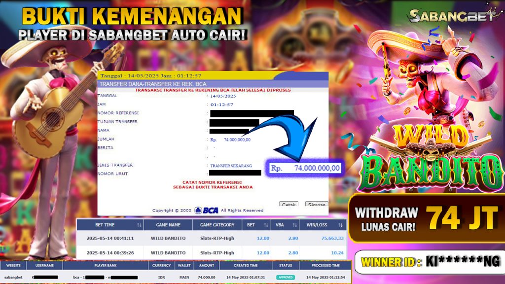 BUKTI KEMENANGAN 14 MEI 2025 DI GAME WILD BANDITO WD 74 JUTA