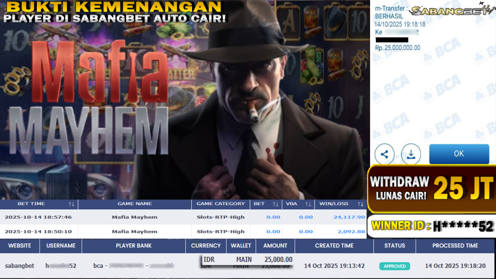 BUKTI KEMENANGAN 14 OKTOBER 2025 DI GAME MAFIA MAYHEM WD 25 JUTA