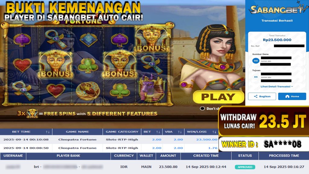 BUKTI KEMENANGAN 14 SEPTEMBER 2025 DI GAME Cleopatra Fortune WD 23.5 JUTA