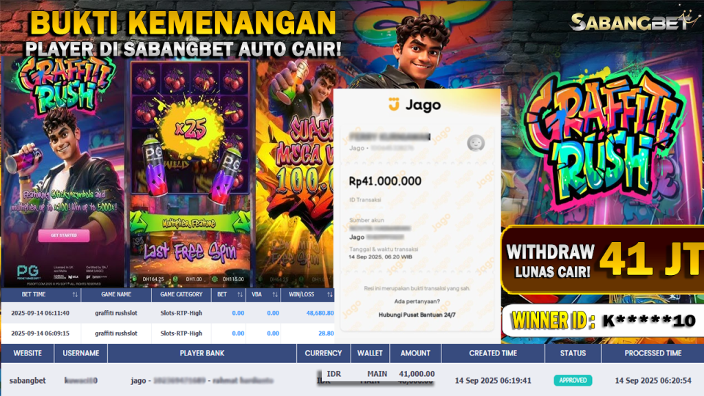 BUKTI KEMENANGAN 14 SEPTEMBER 2025 DI GAME GRAFFITI RUSHSLOT WD 41 JUTA