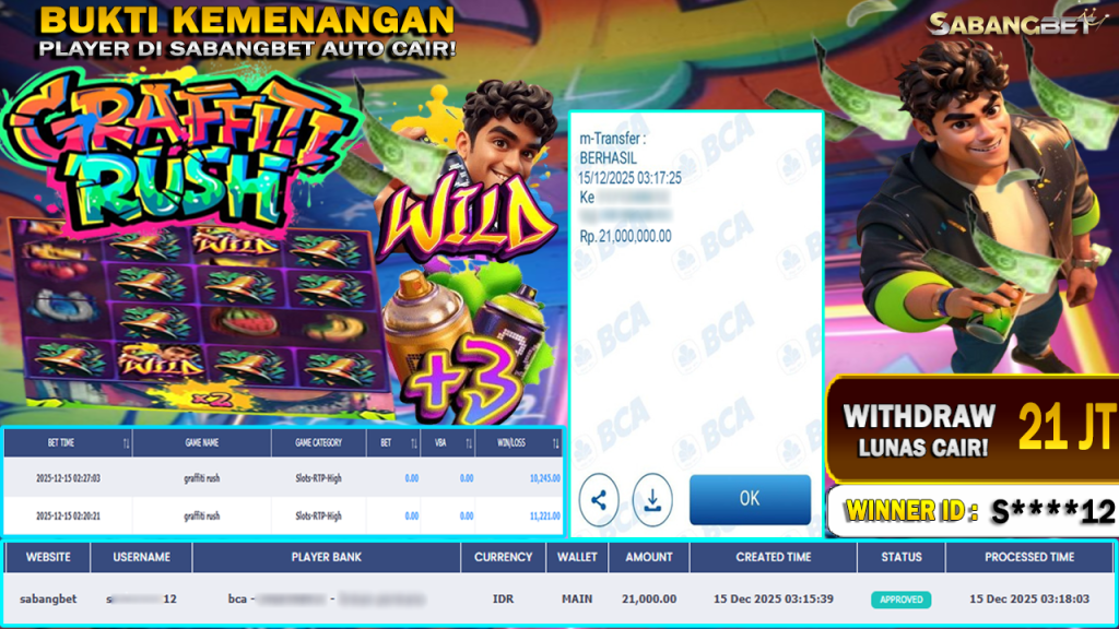 BUKTI KEMENANGAN 15 DESEMBER 2025 DI GAME GRAFFITI RUSH WD 21 JUTA