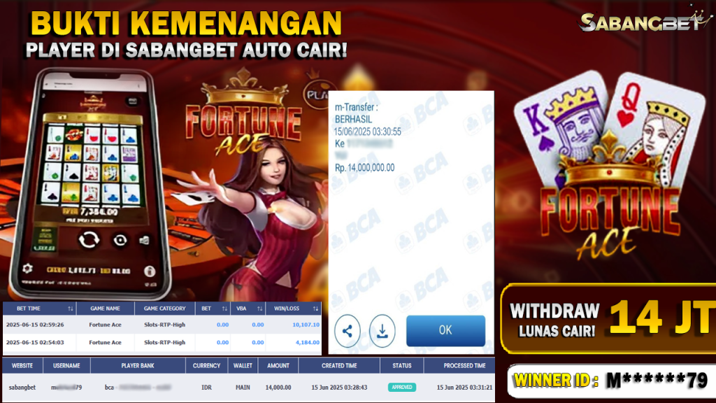 BUKTI KEMENANGAN 15 JUNI 2025 DI GAME FORTUNE ACE WD 14 JUTA