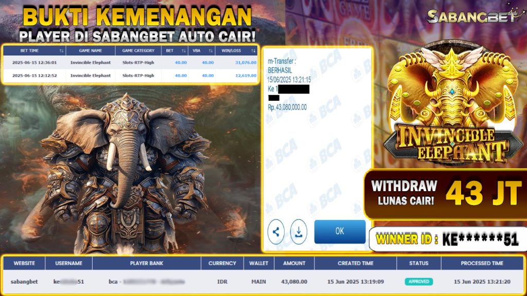 BUKTI KEMENANGAN 15 JUNI 2025 DI GAME INVINCIBLE ELEPHANT WD 43 JUTA