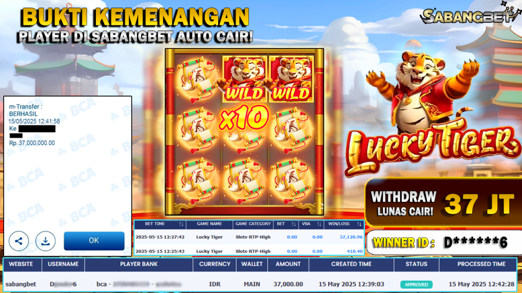 BUKTI KEMENANGAN 15 MEI 2025 DI GAME LUCKY TIGER WD 37 JUTA