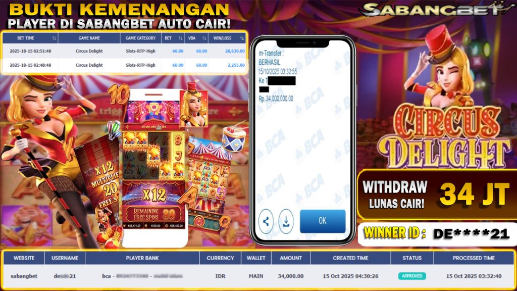 BUKTI KEMENANGAN 15 OKTOBER 2025 DI GAME CIRCUS DELIGHT WD 34 JUTA