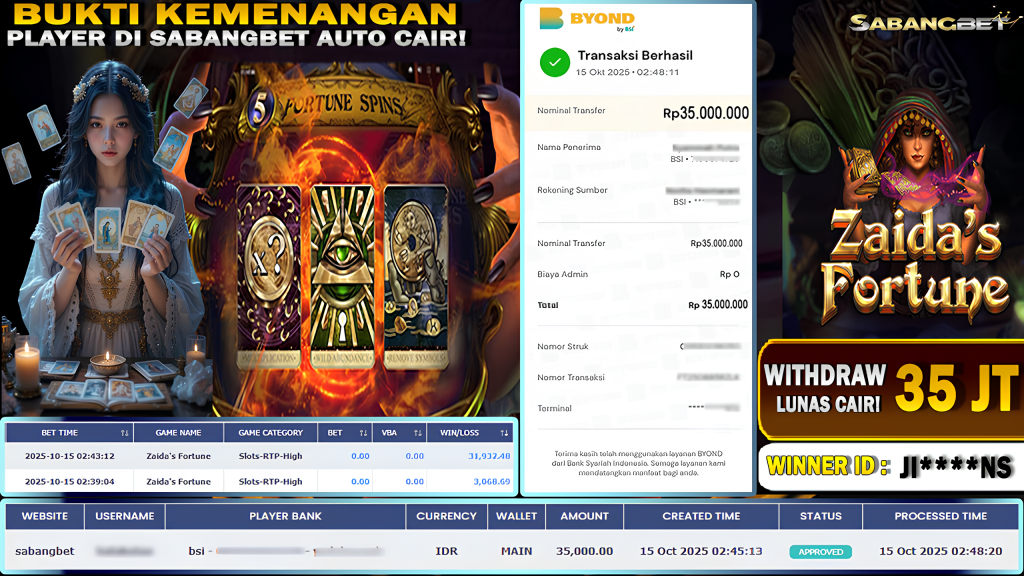 BUKTI KEMENANGAN 15 OKTOBER 2025 DI GAME ZAIDA’S FORTUNE WD 35 JUTA