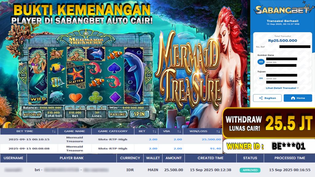 BUKTI KEMENANGAN 15 SEPTEMBER 2025 DI GAME Mermaid Treasure WD 25.5 JUTA