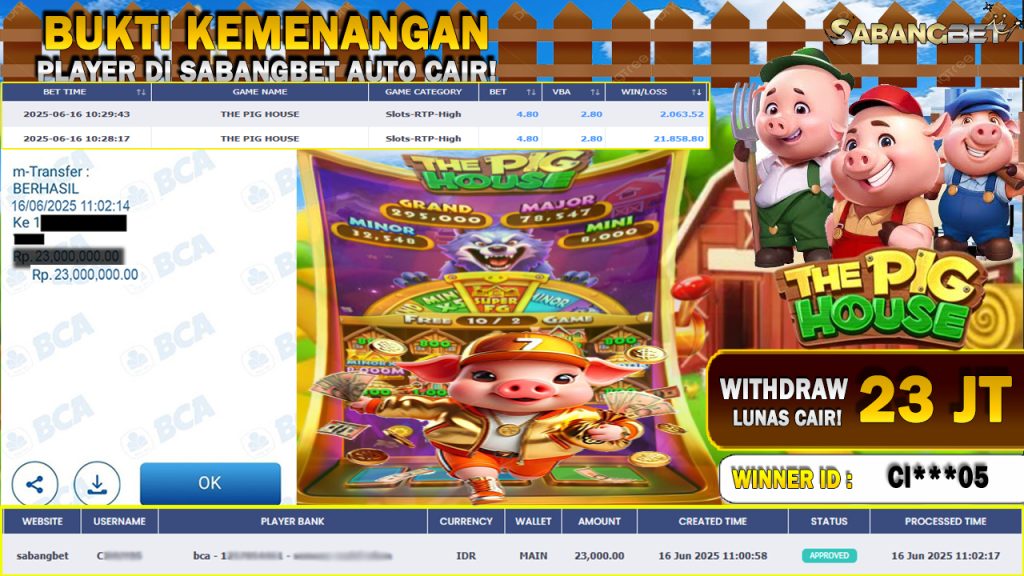 BUKTI KEMENANGAN 16 JUNI 2025 DI GAME THE PIG HOUSE JILI WD 23 JUTA