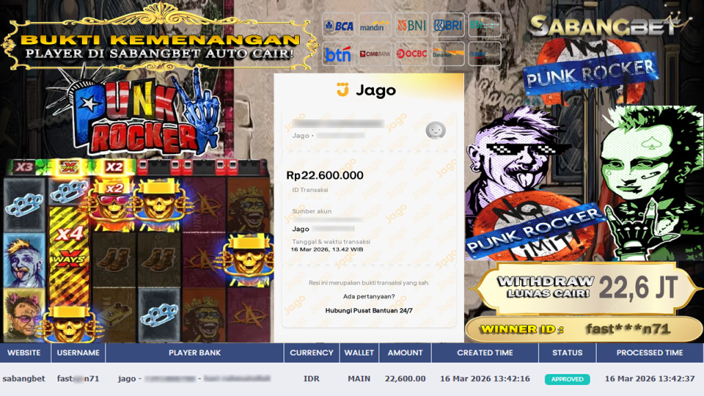BUKTI KEMENANGAN 16 MARET 2026 DI GAME PUNK ROCKER WD 22,6 JUTA
