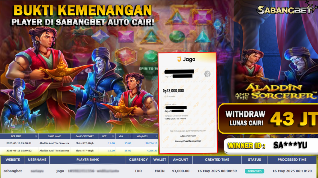 BUKTI KEMENANGAN 16 MEI 2025 DI GAME ALADDIN AND THE SORCERER WD 43 JT