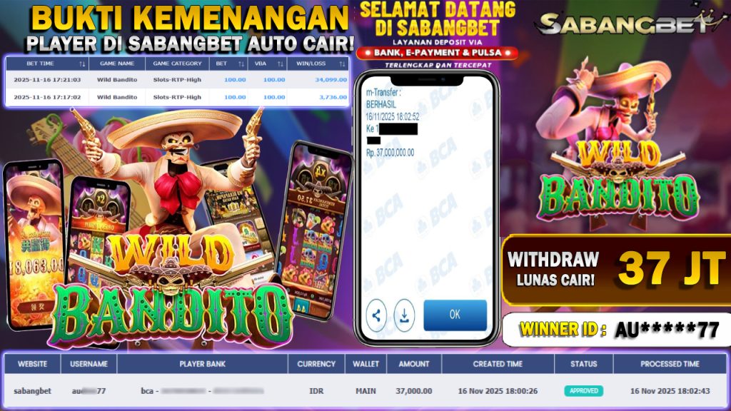 BUKTI KEMENANGAN 16 NOVEMBER 2025 DI GAME WILD BANDITO WD 37 JUTA