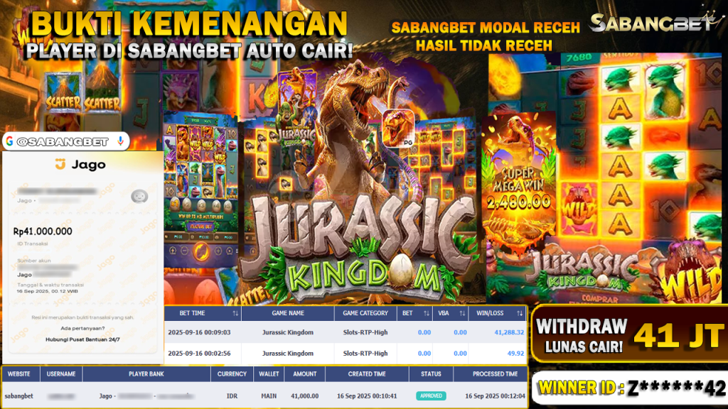 BUKTI KEMENANGAN 16 SEPTEMBER 2025 DI GAME JURASSIC KINGDOM ( POCKET GAME SOFT ) WD 41 JUTA