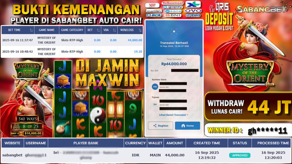 BUKTI KEMENANGAN 16 SEPTEMBER 2025 DI GAME MYSTERY OF THE ORIENT WD 44 JUTA