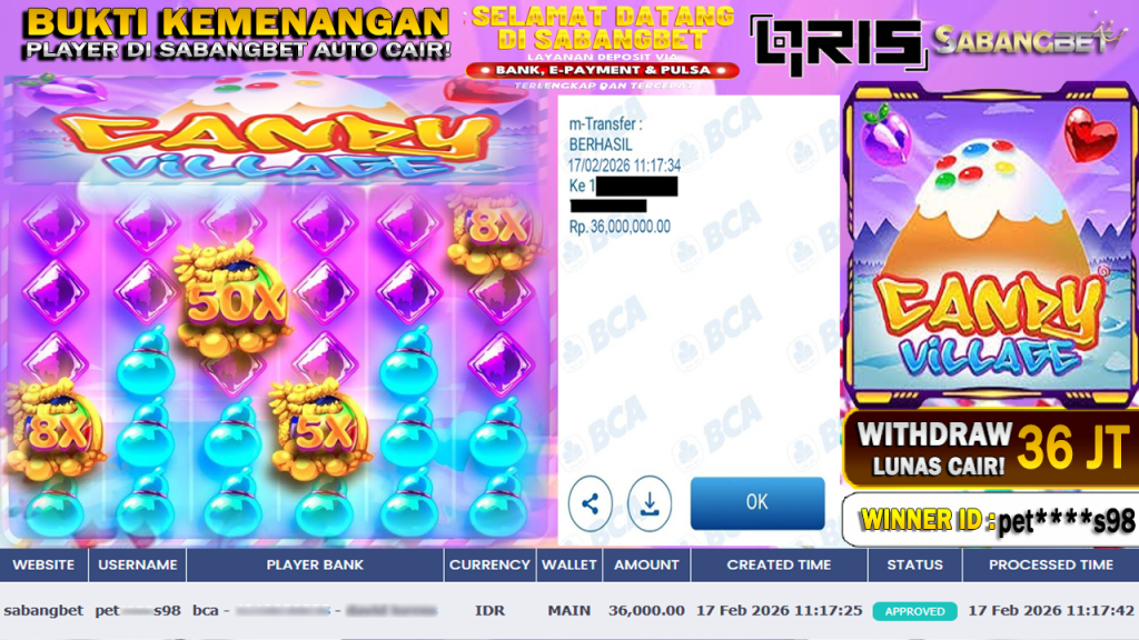 BUKTI KEMENANGAN 17 FEBRUARI 2026 DI GAME CANDY VILLAGE WD 36 JUTA