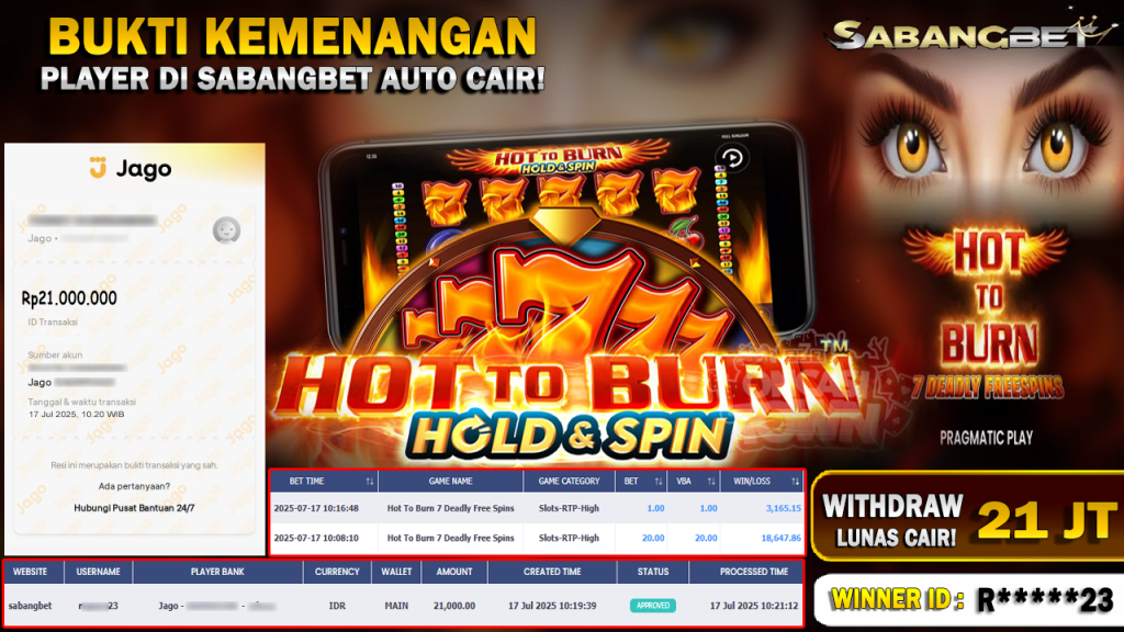 BUKTI KEMENANGAN 17 JULI 2025 DI GAME HOT TO BURN 7 DEADLY FREE SPINS WD 21 JUTA