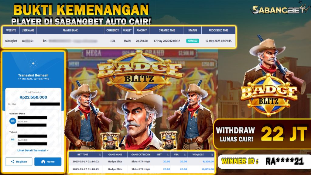 BUKTI KEMENANGAN 17 MEI 2025 DI GAME BADGE BLITZ WD 22 JUTA