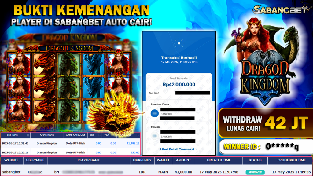 BUKTI KEMENANGAN 17 MEI 2025 DI GAME DRAGON KINGDOM WD 42 JUTA
