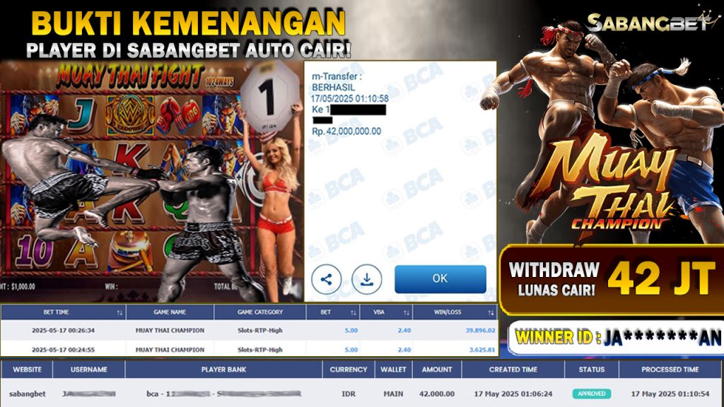 BUKTI KEMENANGAN 17 MEI 2025 DI GAME MUAY THAI CHAMPION PG SOFT WD 42 JUTA