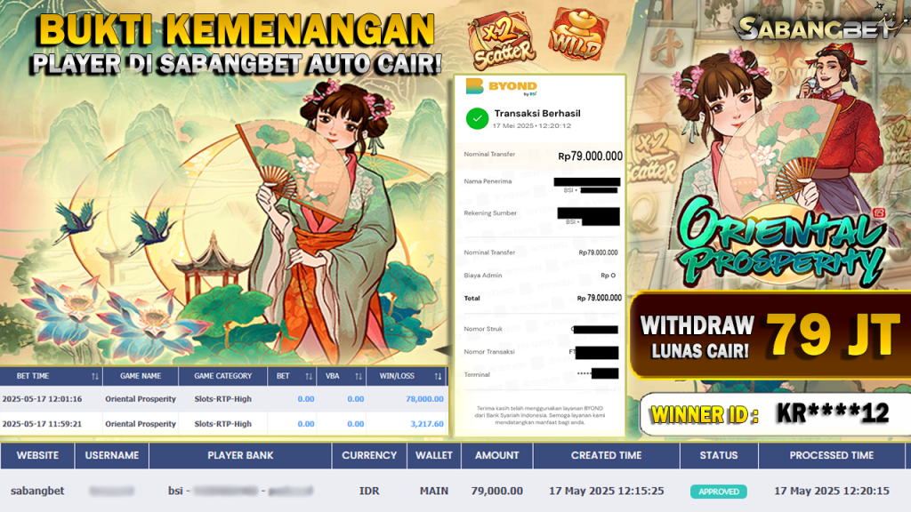 BUKTI KEMENANGAN 17 MEI 2025 DI GAME ORIENTAL PROSPERITY’ PG SOFT WD 79 JUTA