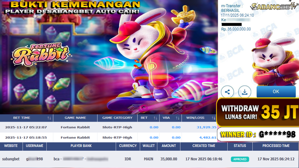 BUKTI KEMENANGAN 17 NOVEMBER 2025 DI GAME FORTUNE RABBIT WD 35 JUTA