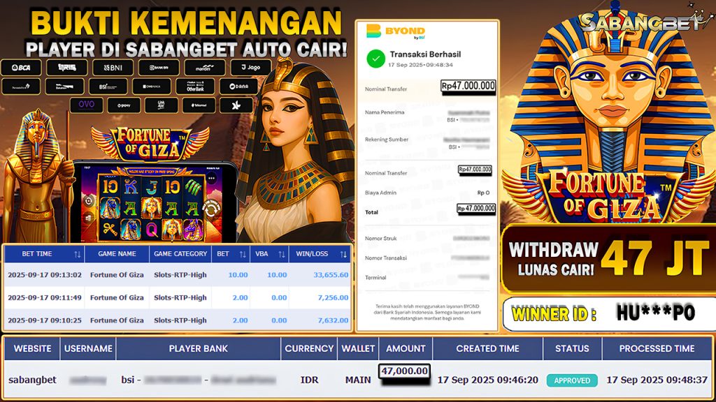 BUKTI KEMENANGAN 17 SEPTEMBER 2025 DI GAME Fortune Of Giza WD 47 JUTA