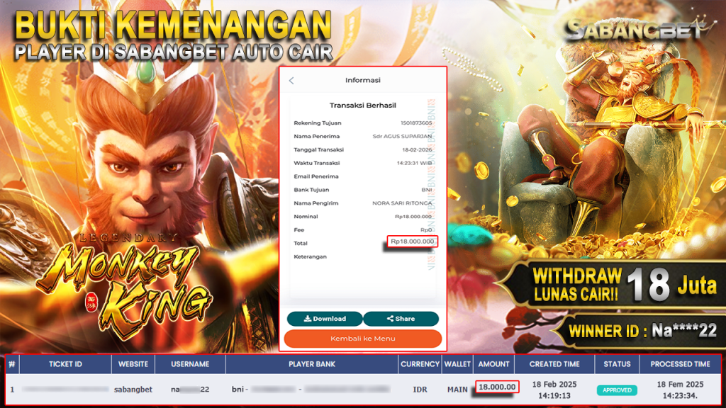 BUKTI KEMENANGAN 18 FEBRUARI 2026 DI Game Legendary Monkey King WD 18 JUTA