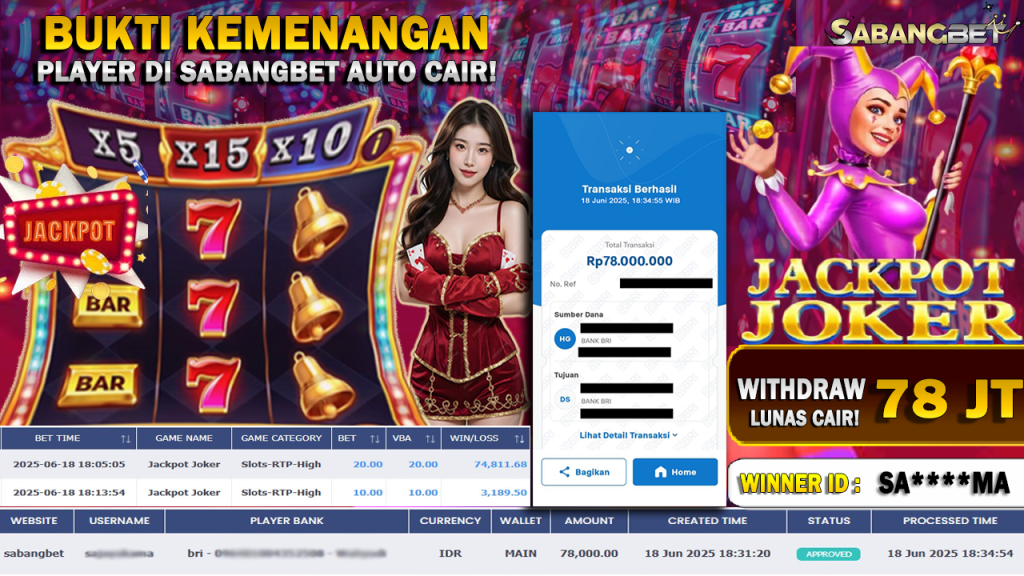 BUKTI KEMENANGAN 18 JUNI 2025 DI GAME JACKPOT JOKER WD 78 JUTA