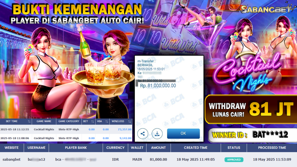 BUKTI KEMENANGAN 18 MEI 2025 DI GAME COCKTAIL NIGHTS’ PG SOFT’ WD 81 JUTA