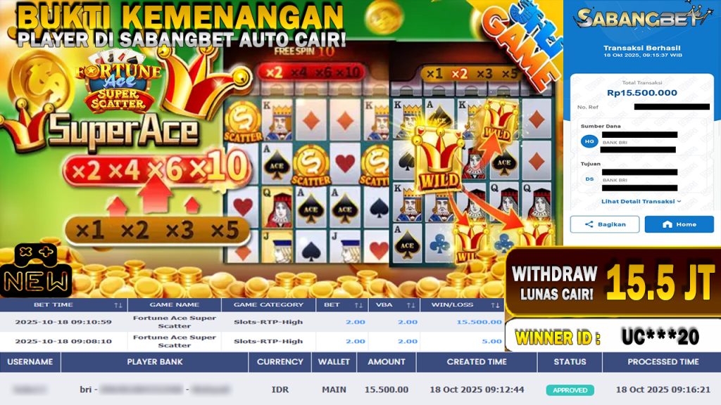 BUKTI KEMENANGAN 18 OKTOBER 2025 DI GAME Fortune Ace Super Scatter WD 15.5 JUTA