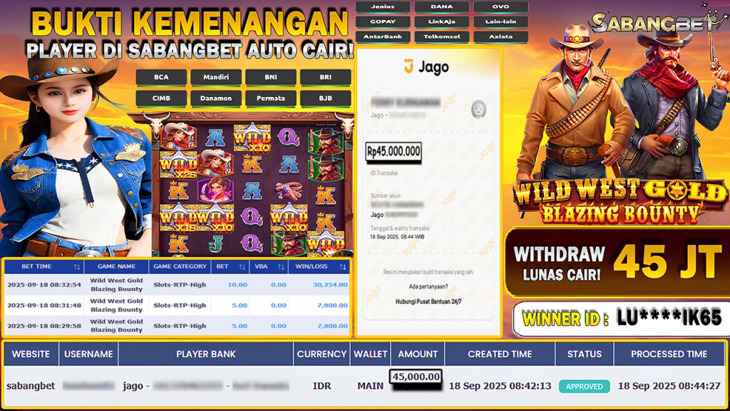BUKTI KEMENANGAN 18 SEPTEMBER 2025 DI GAME Wild West Gold Blazing Bounty WD 45 JUTA