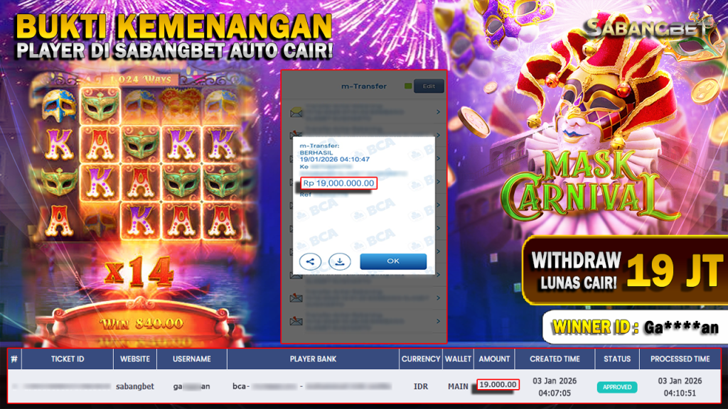 BUKTI KEMENANGAN 19 JANUARI 2026 DI Mask Carnival WD 19 JUTA