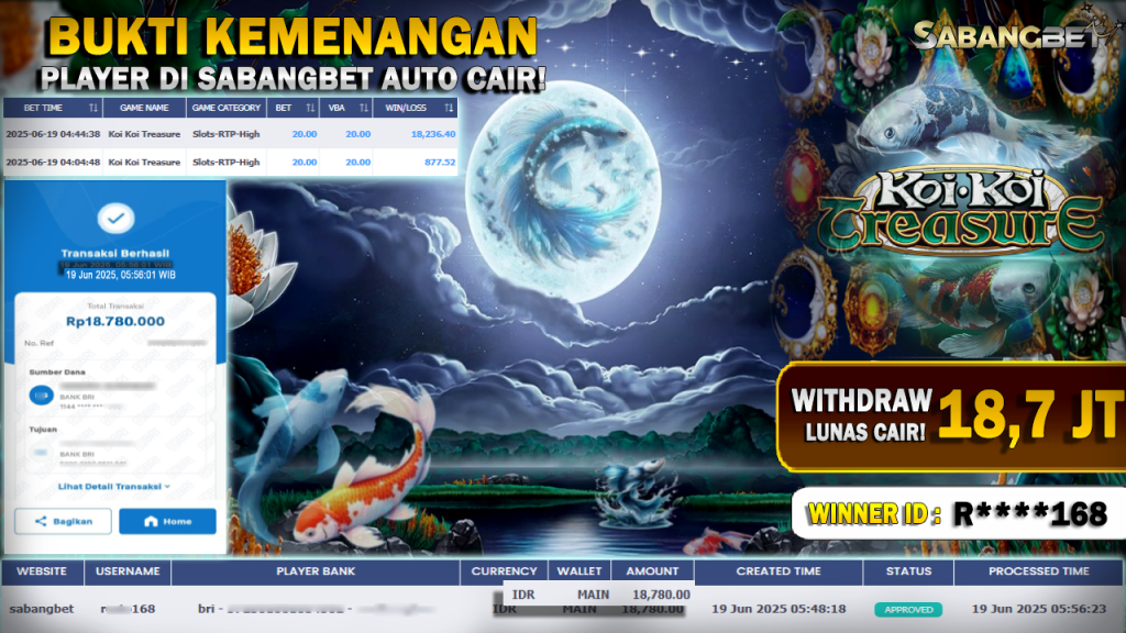 BUKTI KEMENANGAN 19 JUNI 2025 DI GAME KOI KOI TREASURE WD 18,7 JUTA