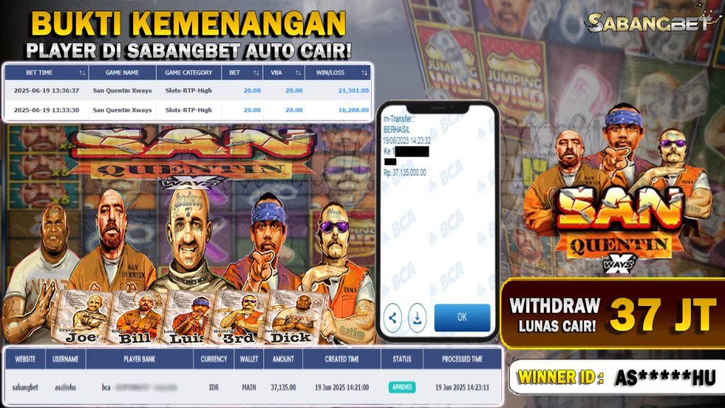 BUKTI KEMENANGAN 19 JUNI 2025 DI GAME SAN QUENTIN XWAYS WD 37 JUTA