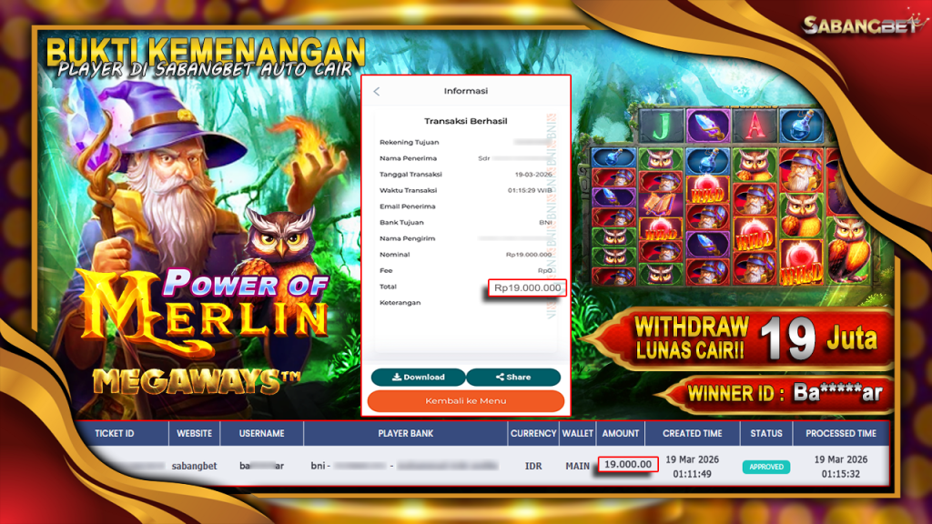 BUKTI KEMENANGAN 19 MARET 2026 DI GAME Power Of Merlin Megaways WD 19 JUTA